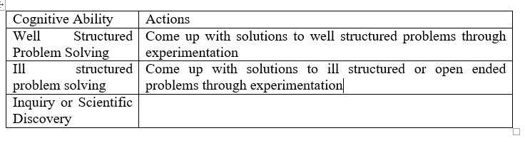 Inquiry Skills - The students are said to have developed these skills if they are able to carry out the following tasks - Formulate question or problem to be investigated, Formulate hypothesis, Determining replications, Identifying treatments, Defining dependent variable, Defining independent variable, Design experiment, Design observation and measurement procedures, Predict results, Predict applications based on results, Formulate follow up hypotheses and Apply experimental technique to new problem.