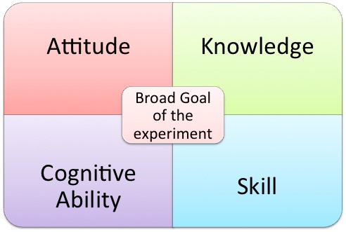 In the first step you need to make a decision regarding the broad goal of the experiment. As you can see from the figure below the goal of the experiment may be one or more of the four dimensions. This is the most important step, as all the further steps will depend on what you wish to achieve from the experiment.