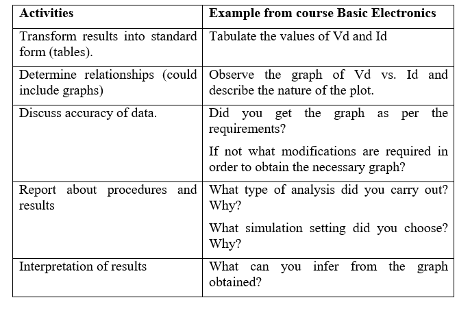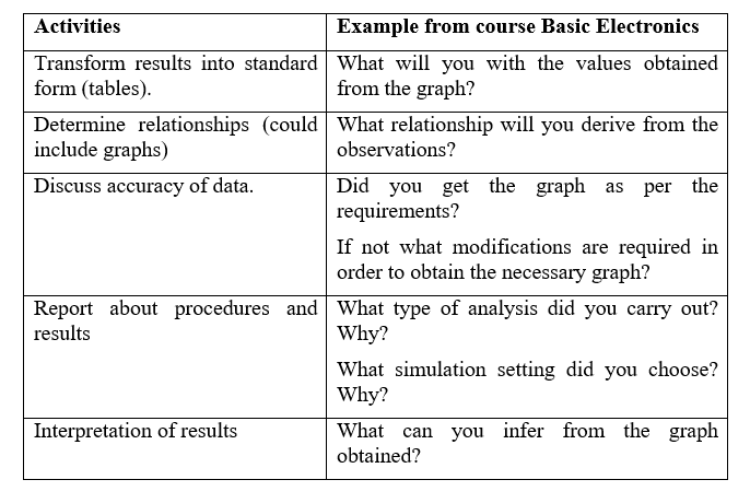 You can design these activities and make the student carry out various tasks depending on the target knowledge and skills and the difficulty level of the experiment you wish to set. In order to assess whether the students are carrying out the tasks/activities various assessment questions may be asked or prompts may be designed to provide opportunities for students to reflect on the results of the tasks/activities.